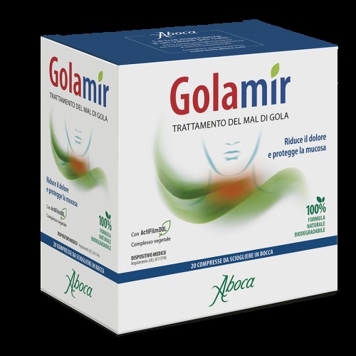 Golamir è un dispositivo medico indicato nei casi di mal di gola per il trattamento degli stati irritativi e infiammatori del cavo orofaringeo, che possono essere causati da virus, batteri, allergeni o dal contatto con agenti esterni irritanti (fumo, smog, polvere). Il prodotto è adatto anche negli stati di raffreddamento dove le secrezioni nasali, scendendo nella gola, possono essere causa di irritazione.