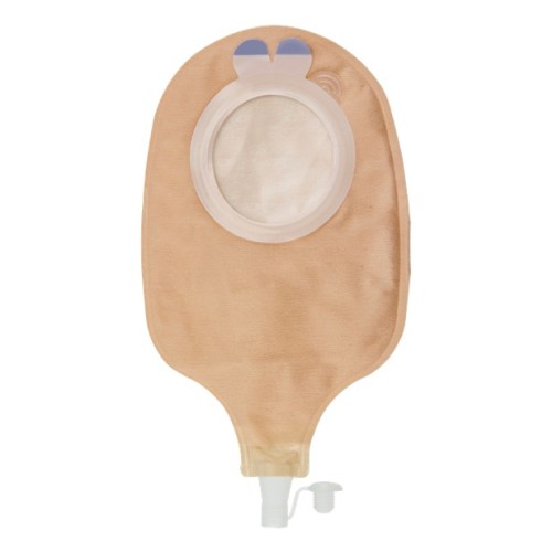 Sacca urostomia per sistema due pezzi, trasparente od opaca, di forma anatomica, dotata di flangia per aggancio alla placca, rivestita sul lato corpo da un morbido tessuto non tessuto, in versione opaca o trasparente. La versione opaca sul lato esterno è rivestita da uno specifico materiale che oltre a ridurre i rumori evita spiacevoli attriti con gli abiti. Dotata di sistema antireflusso e di scarico, raccordabile a raccoglitore da gamba o da letto.