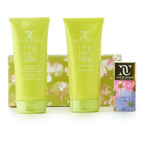 Kit contenente crema doccia (200 ml), crema olio nutriente (200 ml), olio labbra (4,5 ml).