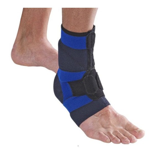 Doppia benda di stabilizzazione con protezione del collo del piede. Regolazione con chiusura a strappo anteriore e cinturino elastico superiore.