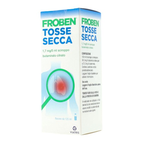 AvvertenzeA causa dell’inibizione del riflesso della tosse da parte del butamirato, l’uso concomitante con espettoranti deve essere evitato, perché può provocare il ristagno di muco nelle vie respiratorie con aumento del rischio di broncospasmo e di infezione delle vie respiratorie. Nei soggetti affetti da grave insufficienza renale e/o epatica, FROBEN TOSSE SECCA va somministrato solo in caso di effettiva necessità e sotto il diretto controllo del medico, tenuto conto che i tassi plasmatici efficaci di butamirato citrato possono essere più elevati e/o duraturi che nei soggetti con funzionalità epatica e/o renale normale. FROBEN TOSSE SECCA contiene glicerolo, sorbitolo e paraidrossibenzoato. Può causare mal di testa, disturbi gastrici e diarrea. I pazienti affetti da rari problemi ereditari di intolleranza al fruttosio, non devono assumere questo medicinale. Può causare reazioni allergiche (anche ritardate).