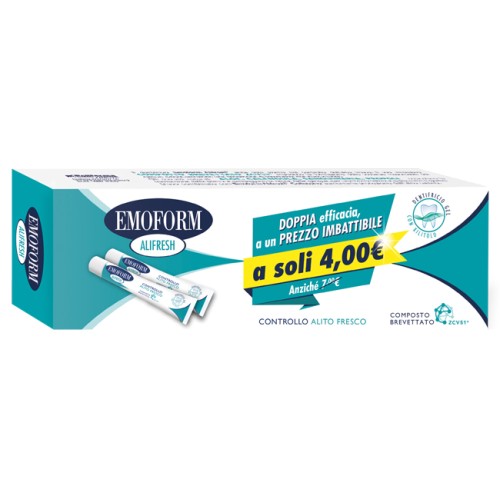 Il dentifricio Emoform Alifresh aiuta ogni giorno nel controllo dell'alito fresco.