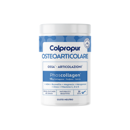 L'azione sull'apparato muscolo-scheletrico di Colpropur OSTEOARTICOLARE si basa principalmente sulle proprietà di un ingrediente esclusivo: il Phoscollagen®, composto da peptidi bioattivi di collagene idrolizzato Colpropur D® e fosfato di calcio, dosati nella corretta proporzione necessaria per mantenere ossa sane.