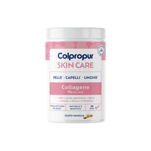 Colpropur SKIN CARE è un integratore alimentare a base di collagene idrolizzato, coenzima Q10, acido ialuronico, silicio, selenio, zinco e vitamine B2, B3, B8, C, E, pensato per il benessere di pelle, capelli e unghie con una mirata azione anti-età.