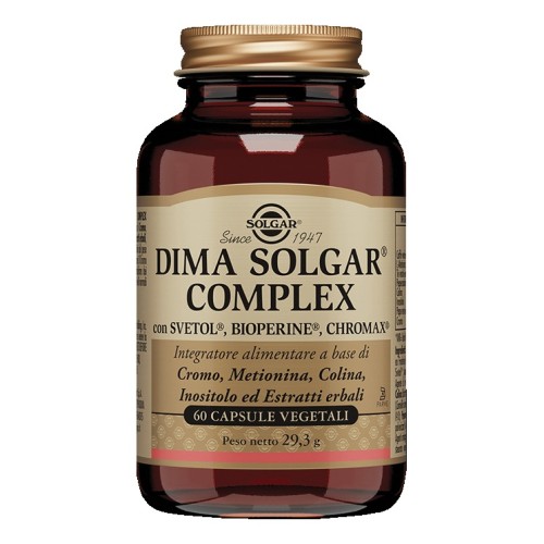 DIMA SOLGAR COMPLEX contiene l'estratto brevettato di semi di caffè verde decaffeinato (Svetol), metionina, colina, inositolo, peperoncino, tè verde e cromo picolinato (Chromax). Peperoncino (Capsicum annuum L.) e pepe nero (Bioperine) supportano la funzione digestiva con miglioramento dell'assorbimento dei nutrienti. Il cromo (picolinato Chromax) contribuisce al mantenimento di livelli normali di glucosio nel sangue. Elevati livelli di glucosio e la resistenza insulinica sono associabili a un accumulo di tessuto adiposo a livello del girovita. Il tè verde favorisce l'equilibrio del peso corporeo e il drenaggio dei liquidi. Il frutto di peperoncino (Capsicum annuum L.) contribuisce allo stimolo del metabolismo oltre a regolare la motilità gastro-intestinale ed eliminazione dei gas e a svolgere azione antiossidante.