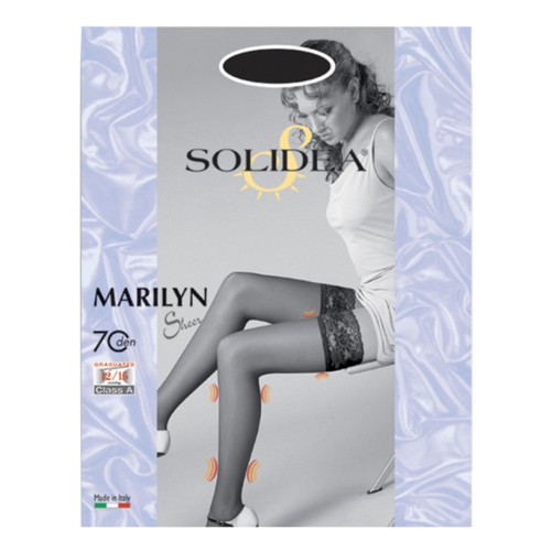 Calza autoreggente 70 den a maglia liscia. Velata e raffinata, valorizza il fascino e la sensualità femminile con una seducente balza in pizzo. La compressione graduata 12/15 mmHg offre sollievo alle gambe prevenendo stanchezza e pesantezza.Con soletta anatomica anti-stress.